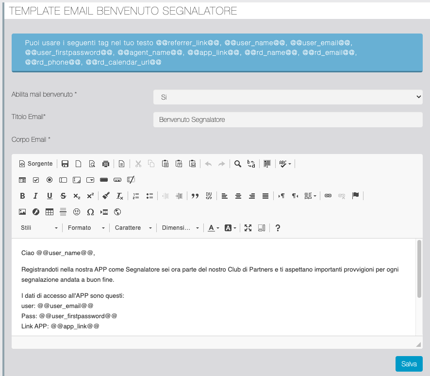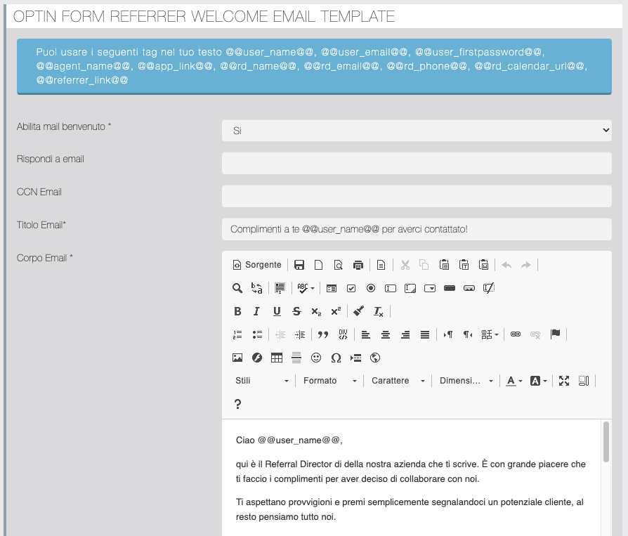 In questa sezione è possibile personalizzare la email inviata all'utente dopo l'invio del form di optin. All'utente viene automaticamente creato un account nella app in questo caso, dunque tra i vari tag disponibili ci sono @@user_email@@ e @@user_firstpassword@@ importanti da inserire nel messaggio per comunicarli al nuovo iscritto. Particolarmente importante anche @@referrer_link@@ poiché con questo link il Segnalatore potrà invitare i nuovi Prospect che intende segnalare.
