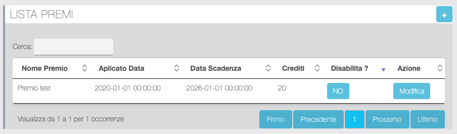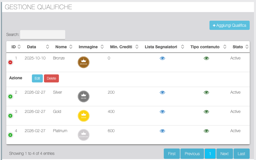 Da questa schermata è possibile aggiungere o modificare una Qualifica definendo nome, soglia di Crediti per ottenerla, caricare un logo che verrà visualizzato dal Segnalatore nella pagina Migareference della app. Inoltre è possibile attivare/disattivare la qualifica.
