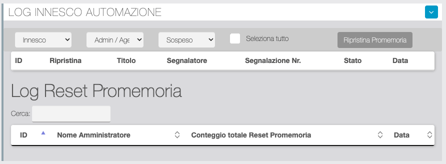 Tabella di log dei Promemoria. È possibile controllare la situazione dei Promemoria filtrando per tipo di promemoria, destinatario del promemoria e stato. È inoltre possibile effettuare un reset di uno o più promemoria selezionandoli singolarmente dalla tabella o con "seleziona tutto".