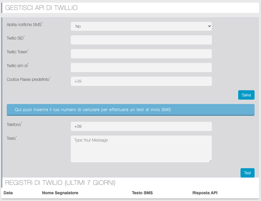 Da questo pannello è possibile abilitare l'invio delle notifiche di stato delle Segnalazioni anche via SMS. Per questa opzione vengono utilizzate le API di Twilio (account Twilio necessario). Il pannello contiene tutti i parametri per impostare il collegamento API, una sezione per effettuare invii di test ed una tabella di log delle comunicazioni degli ultimi 7 giorni.