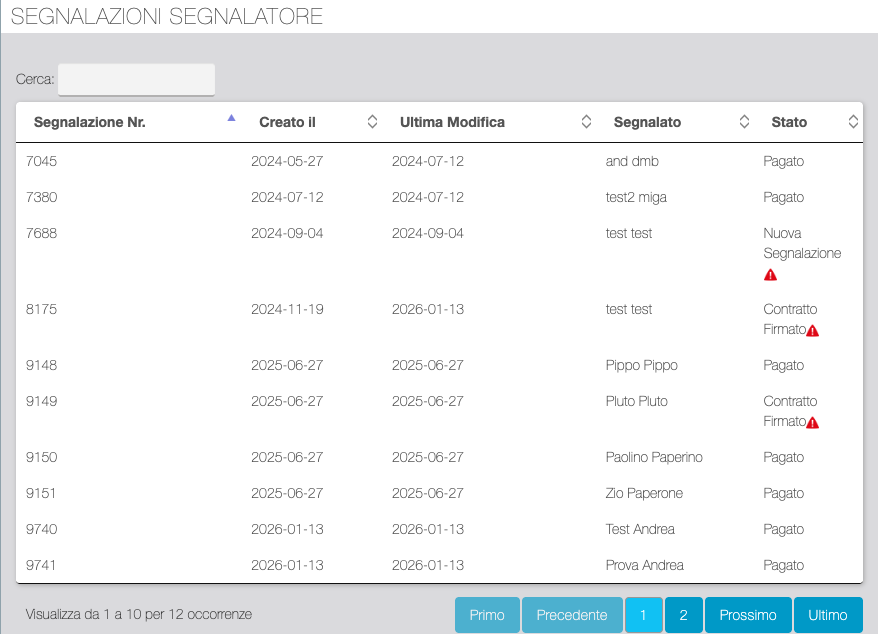 La tabella mostra tutte le segnalazioni registrate