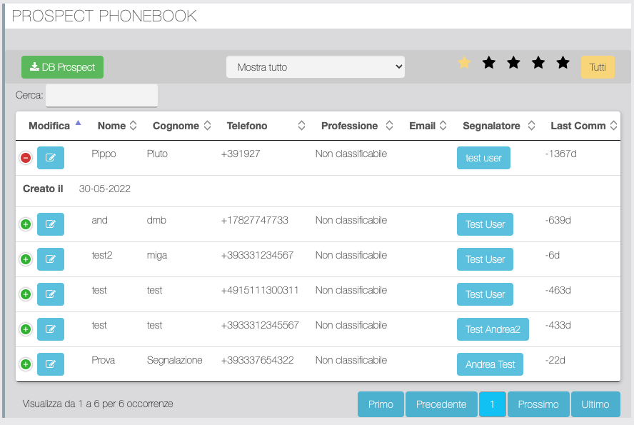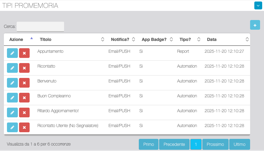 Da questa sezione è possibile inserire e modificare Promemoria automatici. È possibile effettuare degli invii di test con i bottoni corrispondenti presenti in testa alla tabella.
