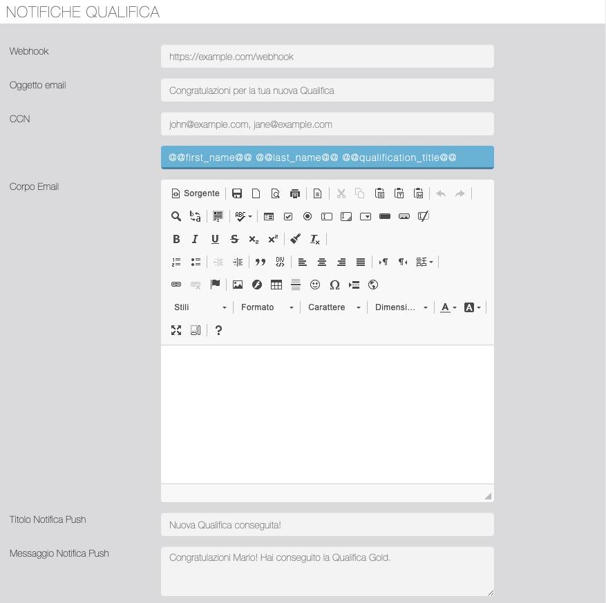 Da questa sezione è possibile personalizzare la notifica email e push inviata al Segnalatore quando raggiunge una nuova Qualifica. Inoltre è possibile impostare un Webhook innescato sempre al conseguimento della nuova Qualifica.