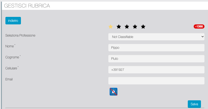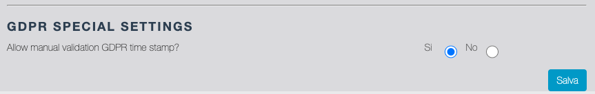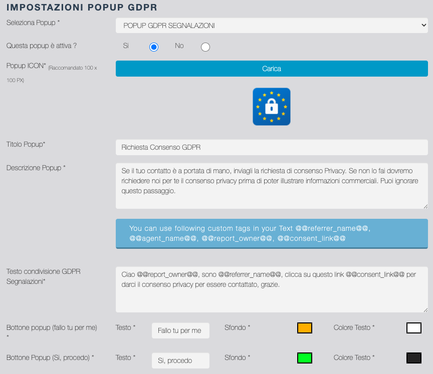 | Abilita GDPR | Se abilitato attiva la gestione della richiesta consenso dalla app: subito dopo l'inserimento di una segnalazione dalla app, il Segnalatore invia un messaggio al Prospect che contiene uno short link ad una landing dove accettare il consenso ad essere richiamato. Se abilitato attiva inoltre l'icona di Stato consenso GDPR (vedi la sezione STATO SEGNALAZIONI) |