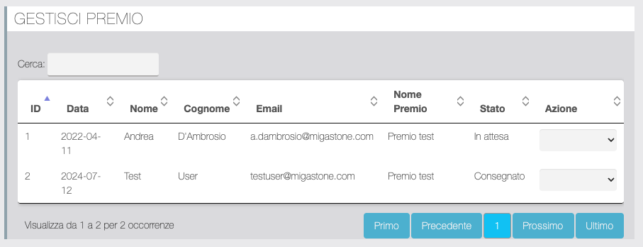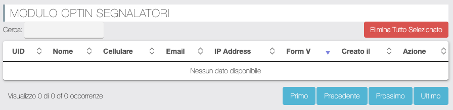 In questa sezione è mostrato un elenco degli optin effettuati utile per eliminare eventuali iscrizioni indesiderate. Utile per discriminare oltre ai dati anagrafici e contatti inseriti, anche l'indirizzo IP e la versione del codice del form utilizzato (poiché nel tempo abbiamo introdotto filtri captcha via via più efficaci).
