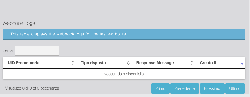 In questa sezione è possibile controllare il log dei webhook sui Promemoria e personalizzare i modelli delle notifiche push/email degli errori.