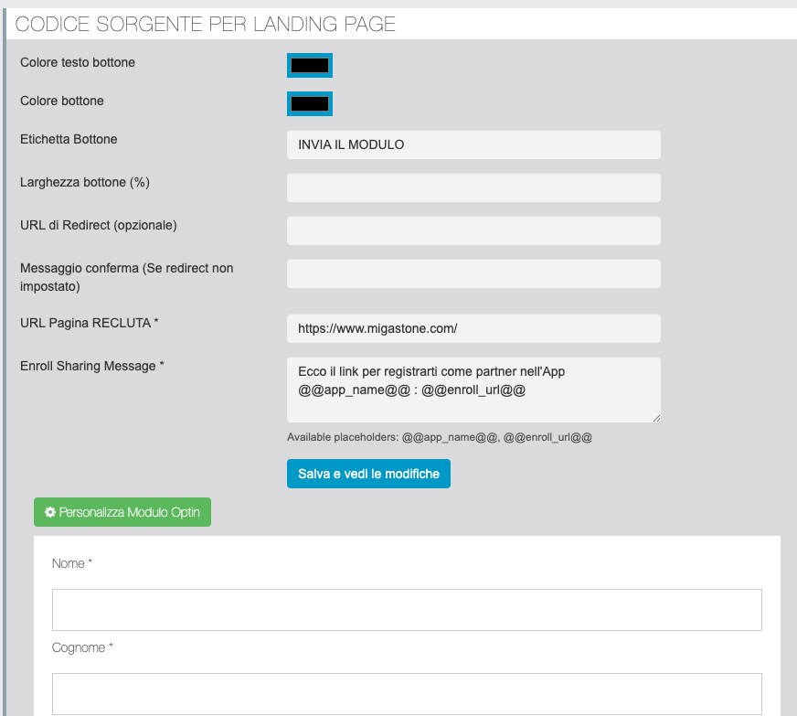 In questa sezione è possibile personalizzare e generare il codice per il Form di Optin da copiare / incollare in Landing Page esterna. Il form di Optin consente agli utenti di iscriversi come Segnalatori. Ai potenziali segnalatori che si iscrivono dal form di Optin viene automaticamente creato un account nella app.