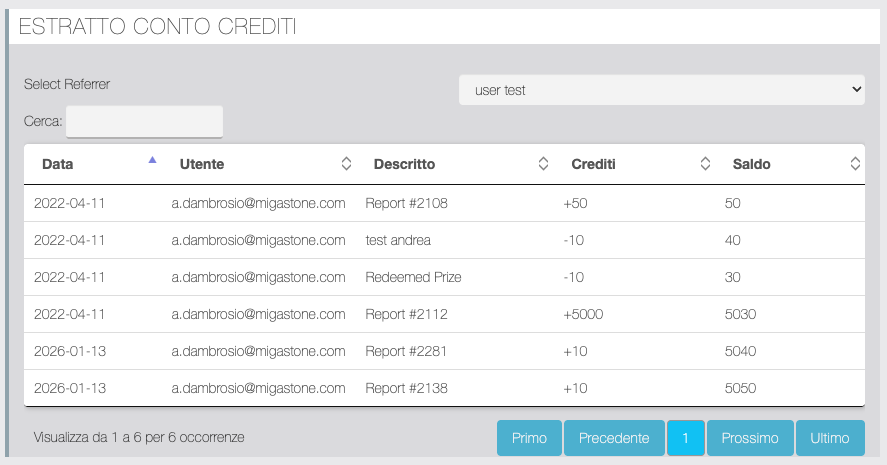 Tabella di log della API Crediti