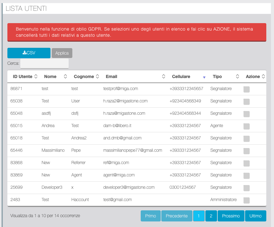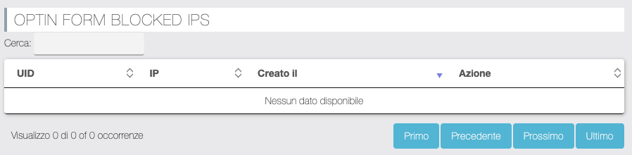 In questa sezione è mostrato un elenco degli optin effettuati utile per eliminare eventuali iscrizioni indesiderate. Utile per discriminare oltre ai dati anagrafici e contatti inseriti, anche l'indirizzo IP e la versione del codice del form utilizzato (poiché nel tempo abbiamo introdotto filtri captcha via via più efficaci).