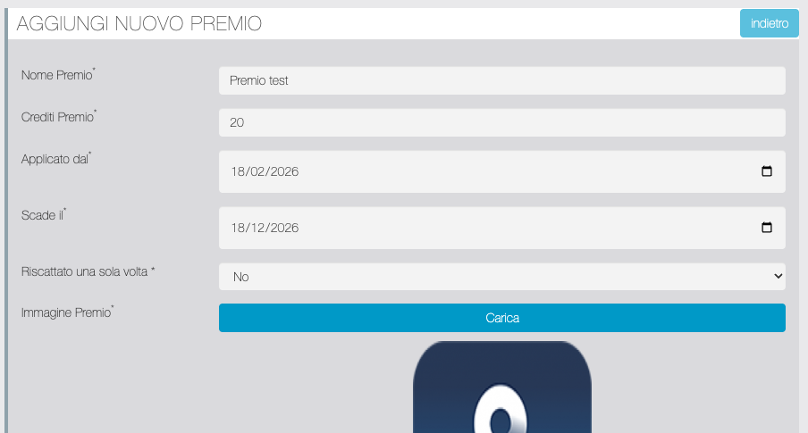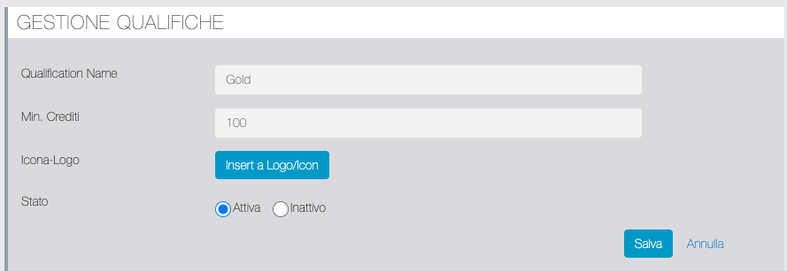 Da questa schermata è possibile aggiungere o modificare una Qualifica definendo nome, soglia di Crediti per ottenerla, caricare un logo che verrà visualizzato dal Segnalatore nella pagina Migareference della app. Inoltre è possibile attivare/disattivare la qualifica.