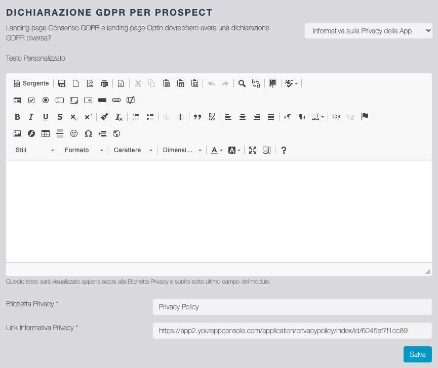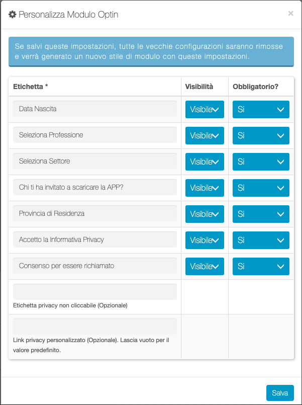 Da questa schermata è possibile attivare/disattivare e rendere obbligatori alcuni campi supplementari del form di Optin. Inoltre è possibile personalizzare l'etichetta del campo Privacy Policy ed inserire un URL se la policy da visualizzare si trova su una pagina esterna. Se l'URL non viene indicato il link porterà alla Privacy Policy generale della app.