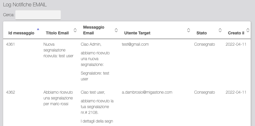 Log Notifiche EMAIL