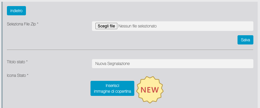 Sezione di configurazione degli stati della segnalazione. È possibile effettuare un reset alle impostazioni di default, scaricare file json ed immagini della configurazione degli stati, aggiungere nuovi stati.
