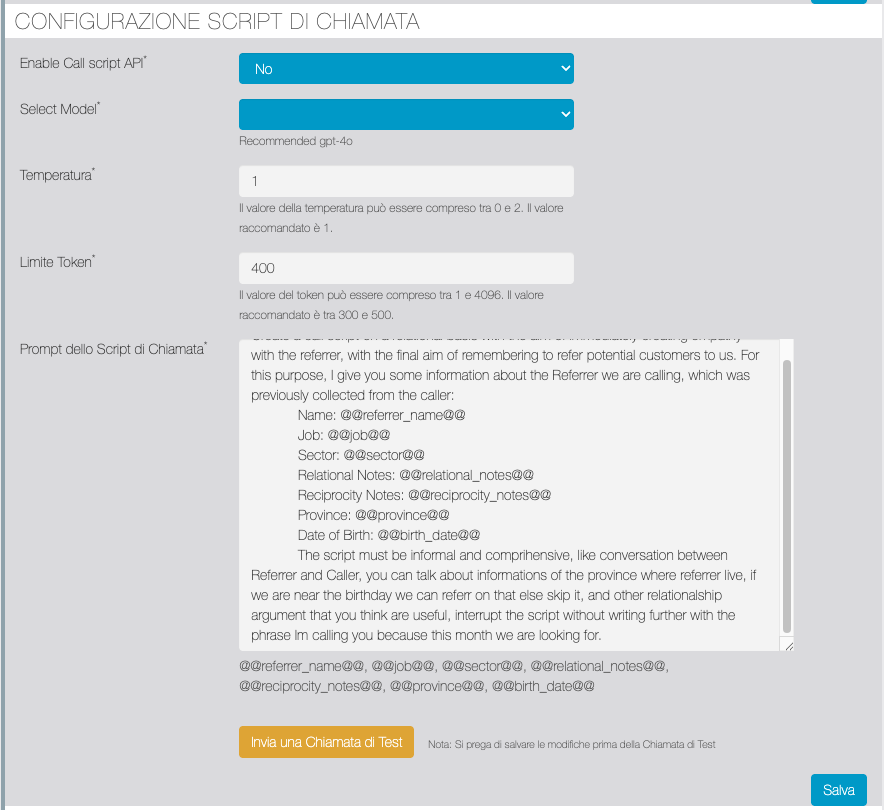 | Prompt Dello Script di Chiamata | Il prompt dello script di chiamata serve per istruire il modello IA che dovrà fornire le risposte. IMPORTANTE: il gestore della app dovrà intervenire nella sezione CONTESTO AZIENDA del prompt sostituendo alle XXXX i dati della propria azienda. |