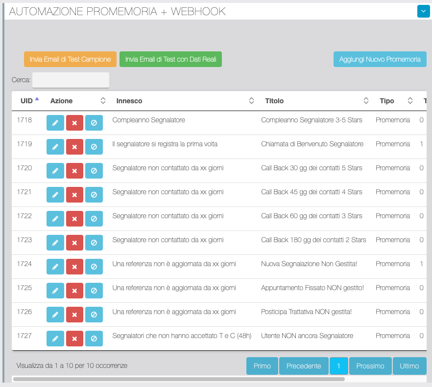 Da questa sezione è possibile inserire e modificare Promemoria automatici. È possibile effettuare degli invii di test con i bottoni corrispondenti presenti in testa alla tabella.