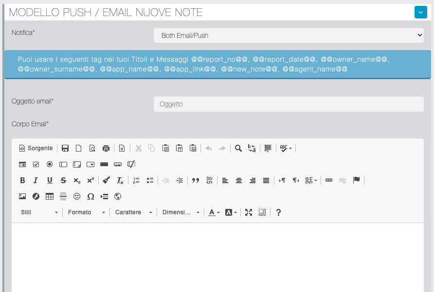 | Oggetto email; Corpo email | Campi per la personalizzazione del modello email. È possibile utilizzare i tag indicati nel riquadro sovrastante. |
