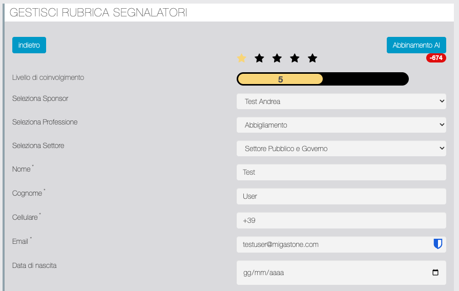 | Data di nascita obbligatoria | Se abilitato rende obbligatorio l'inserimento della data di nascita quando il Segnalatore si registra dalla pagina Impostazioni/Profilo. |