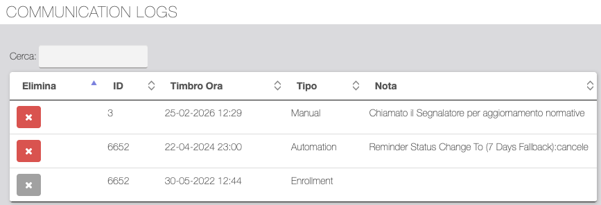 Tabella di log dei Promemoria. È possibile controllare la situazione dei Promemoria filtrando per tipo di promemoria, destinatario del promemoria e stato. È inoltre possibile effettuare un reset di uno o più promemoria selezionandoli singolarmente dalla tabella o con "seleziona tutto".