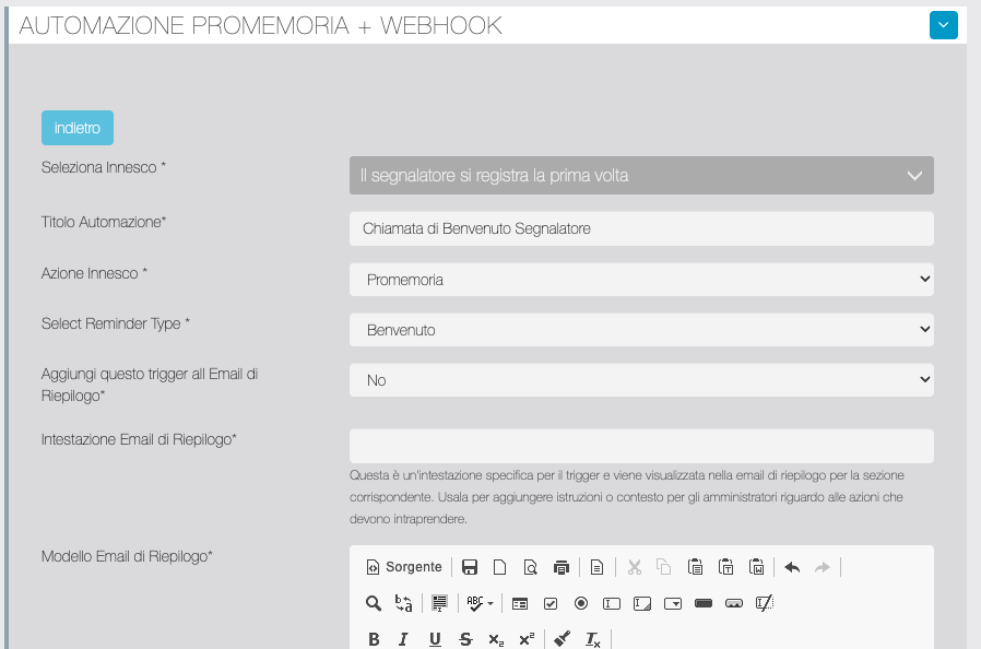 | Abilita WebHook Promemoria? | Se abilitato attiva i webhook dei promemoria automatici (da impostare nella sezione Promemoria) |