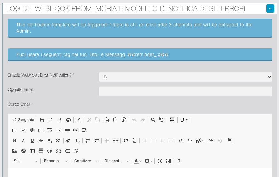 In questa sezione è possibile controllare il log dei webhook sui Promemoria e personalizzare i modelli delle notifiche push/email degli errori.