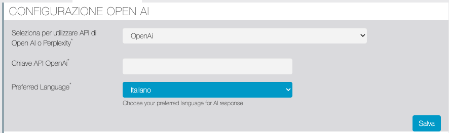 In questa sezione è possibile selezionare quale API AI utilizzare, impostare la relativa chiave API e la lingua predefinita per le risposte della AI.