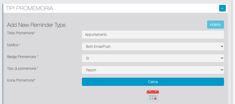 | Tipo notifiche | Con questo campo è possibile scegliere come inviare le notifiche automatiche (solo email, solo notifiche push, entrambe). |