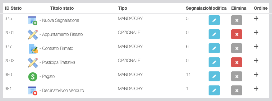 ![]() | Eliminazione dello stato. Il bottone è attivo (rosso) solo per gli stati intermedi. I 4 stati fondamentali non possono essere eliminati: Nuova Segnalazione: stato iniziale. Contratto firmato: valorizza la commissione. Pagato: conferma il pagamento della commissione e incrementa il totale euro o crediti del Segnalatore. Declinato/Non venduto: chiude la lavorazione senza assegnare la commissione. |