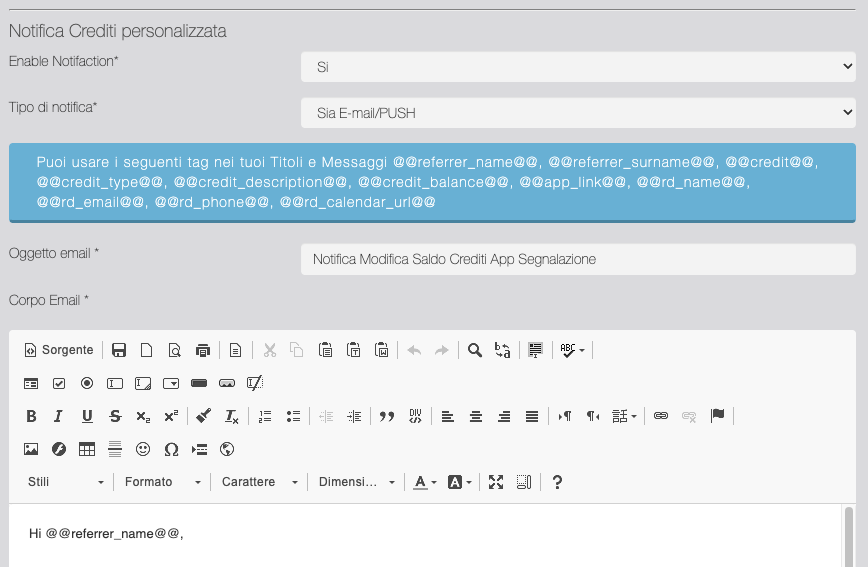 In questa sezione è possibile personalizzare i messaggi di notifica che il Segnalatore riceve quando il gestore effettua una movimentazione manuale del balance Crediti. È possibile scegliere di inviare la notifica via email, push o entrambe.